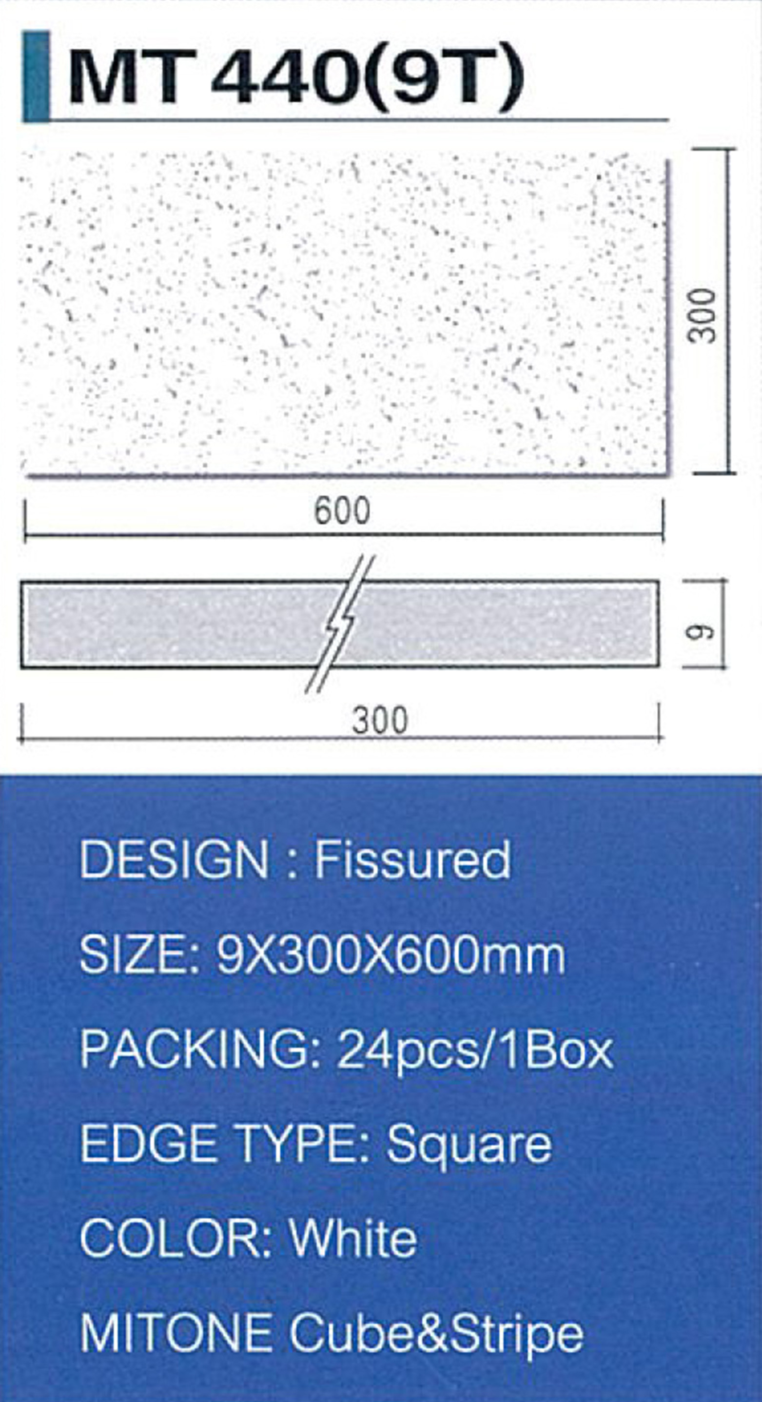 Mitone ลาย Fissured รุ่น MT 440 เป็นผลิตภัณฑ์ที่ผลิตจากโรงงานที่ผ่านมาตรฐานของประเทศเกาหลี (KSA) และสากล ISO ได้รับการทดสอบผลิตภัณฑ์ตามมาตรฐาน ASTM, JIS ลดเสียงสะท้อนและเสียงก้องภายในห้องได้ดี มีขนาด 300 x 600 mm. ที่ความหนา 9 mm. ใช้งานโดยการนำแผ่นฝ้ายึดติดกับผนังหรือเพดานด้วยกาวหรือตะปู ทั้งนี้จะต้องยึดแผ่นยิปซั่มกับโครงคร่าวแล้วจึงติดแผ่นฝ้า เหมาะสำหรับห้องอัดเสียง ห้องซ้อมดนตรี ห้องคาราโอเกะ ห้องอาหาร สถานีวิทยุ สตูดิโอ